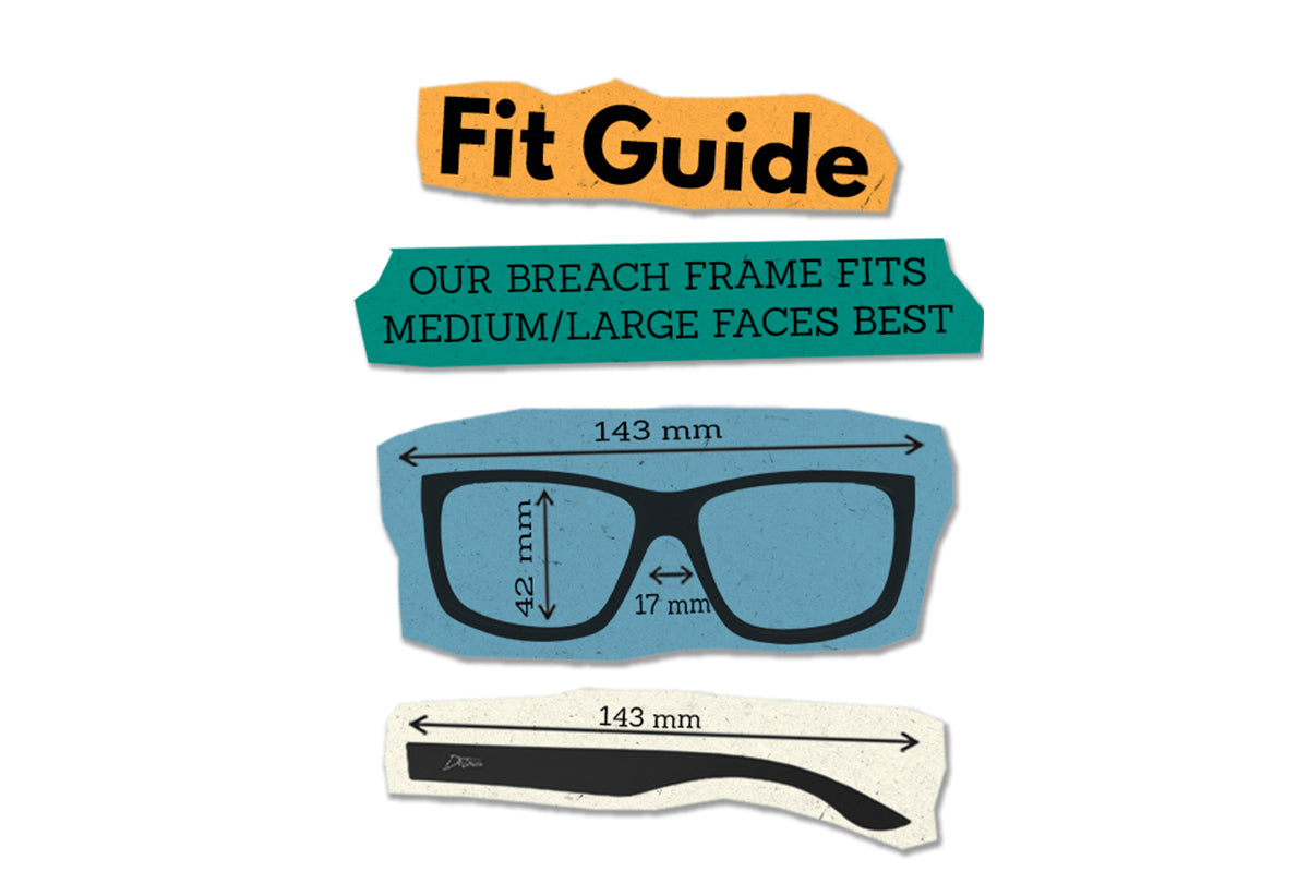 Our Breach frame fits medium/large faces best. Frame width: 143 mm. Lens width: 61 mm. Bridge: 17 mm. Lens height: 42 mm.